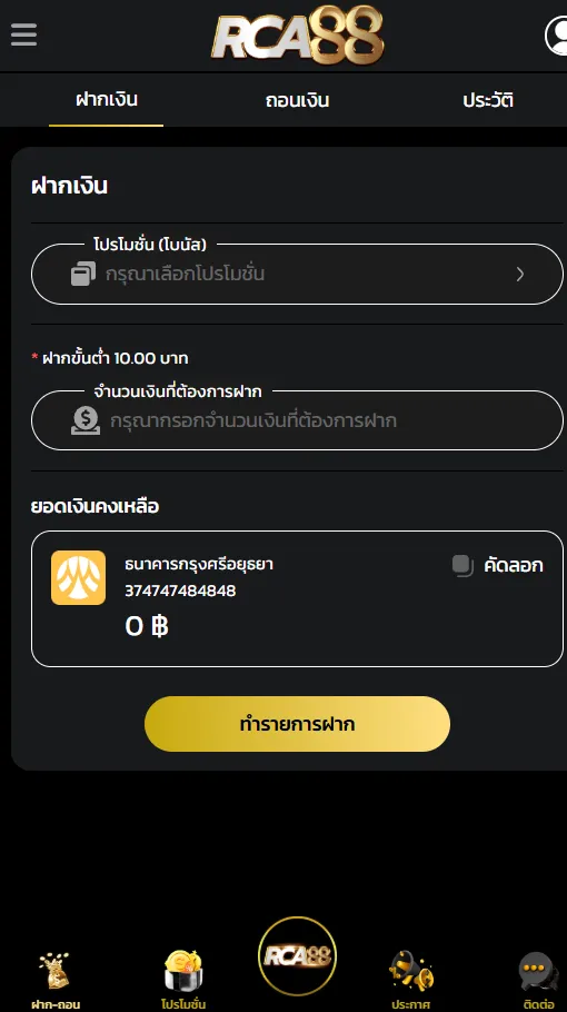 เมื่อเข้าสู่ระบบแล้วให้มองหาปุ่ม “ฝากเงิน” หรือ “Deposit” ที่กดแล้วเข้าสู่หน้าระบบฝากแบบอัตโนมัติ ซึ่งส่วนใหญ่จะอยู่บนหน้าแรกของเว็บไซต์หรือในเมนูบัญชีของคุณ