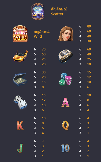 เงินเดิมพันต่อไลน์ x อัตราการจ่าย = 1 บาท x ( 6 สัญลักษณ์ x 40 ) = 240 บาท
